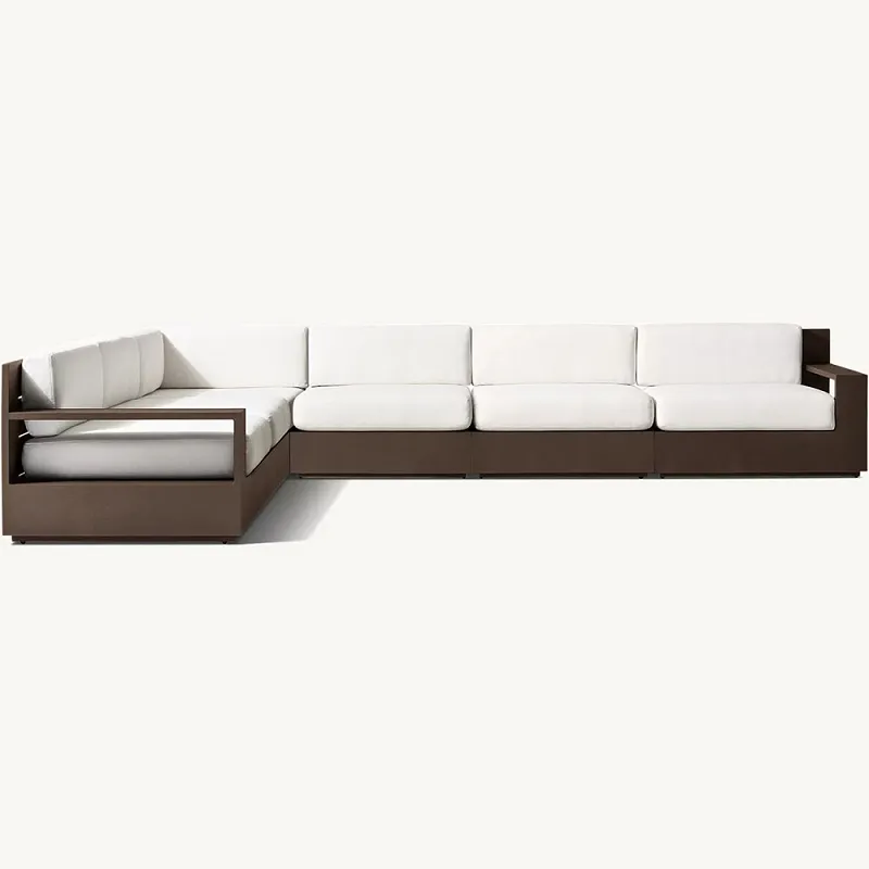 Šim dīvānam ir modulārs dizains, ko var konfigurēt tā, lai tas atbilstu jebkurai āra videi, padarot to par daudzpusīgu izvēli jebkuram piemājas izkārtojumam. Pagalma sekciju dīvāns ir aprīkots ar plīša, jebkuriem laikapstākļiem piemērotiem spilveniem, kas nodrošina izcilu komfortu un atbalstu, kas ir lieliski piemērots stundām relaksācijai vai socializācijai. Alumīnija rāmja eleganto, minimālisma stilu papildina mīkstais polsterējums, kas ir pieejams dažādās krāsās, lai tas atbilstu jebkuram interjeram.